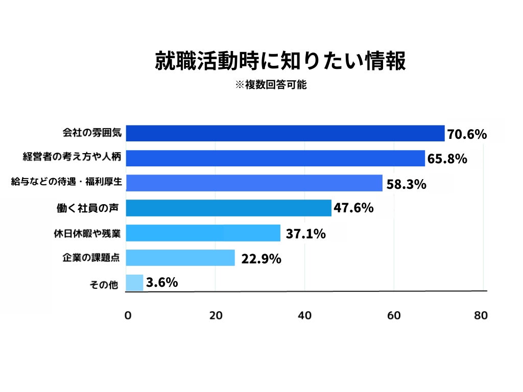 就職活動時に知りたい情報を尋ねたところ、1番多かったのが、「会社の雰囲気」(70.6%)次いで「経営者の考え方や人柄」(65.8%)、「給与などの待遇・福利厚生」(58.3%)、「働く社員の声」(47.6%)となりました。